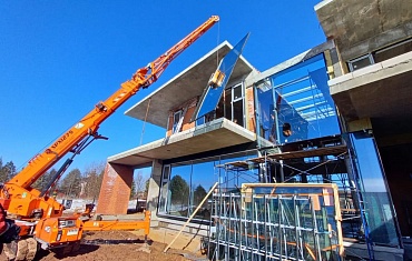 Мини-кран и вакуумный захват Арлифт на сложном остеклении в элитном поселке